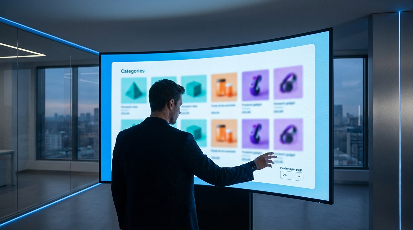 Un homme d'affaires ajuste le nombre de produits par page sur un écran géant. L'optimisation de la pagination est cruciale pour l'expérience utilisateur.